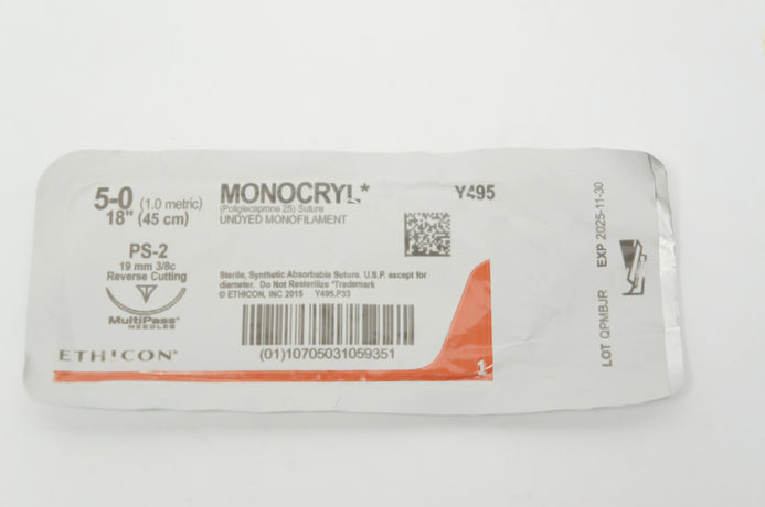 - Ethicon Y495 5-0 MONOCRYL, PS-2, 19mm 3/8c Reverse Cutting, 18inch