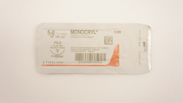 - Ethicon Y495 5-0 Monocryl Stre Undyed PS-2 19mm 3/8c Reverse Cutting, 18inch