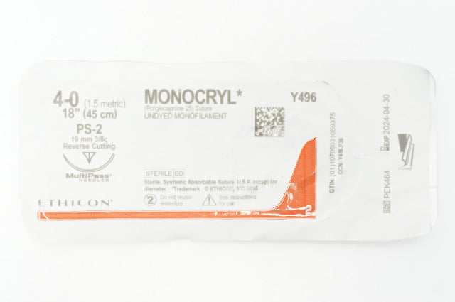 Ethicon Y496 4-0 MONOCRYL Undyed Monofilament PS-2 19mm 3/8c Reverse Cutting, 18inch