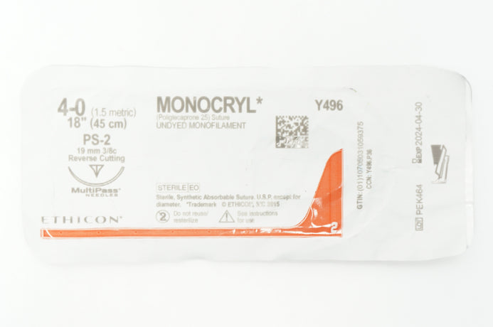 - Ethicon Y496 4-0 MONOCRYL Undyed PS-2 19mm 3/8c Reverse Cutting, 18inch (x)