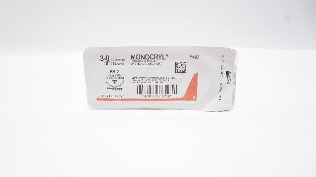 Ethicon Y497 3-0 MONOCRYL Undyed Monofilament Poliglecaprone 25 Sutue PS-2 19mm 3/8c Reverse Cutting, 18inch
