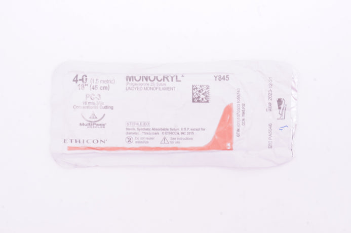 - Ethicon Y845 4-0 Monocryl Stre PC-3 16mm 3/8c Conventional Cutting, 18 inch