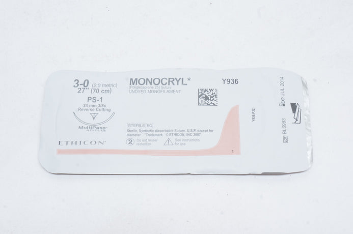 - Ethicon Y936 3-0 MONOCRYL, PS-1, 24mm 3/8c Reverse Cutting, 27inch (x)