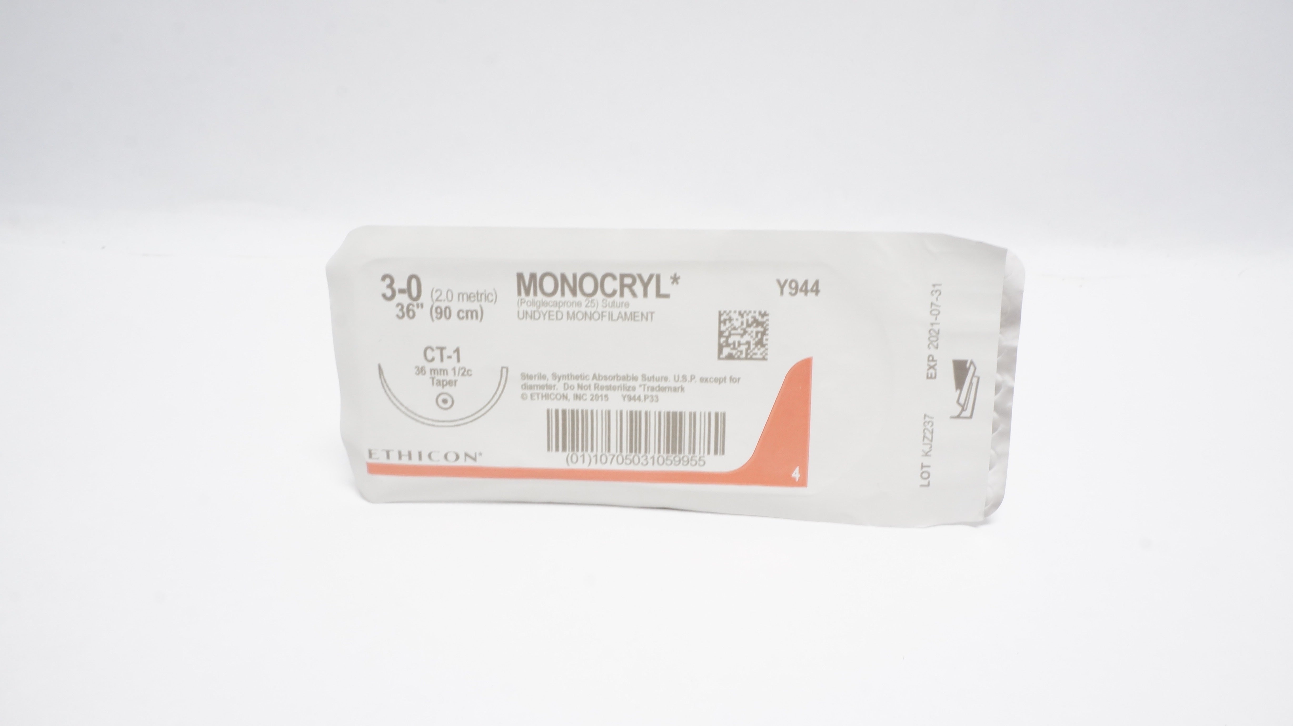 - Ethicon Y944 3-0 Monocryl Poliglecaprone Stre CT-1 36mm 1/2c Taper 36inch (x)