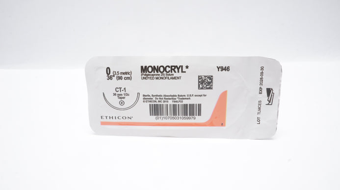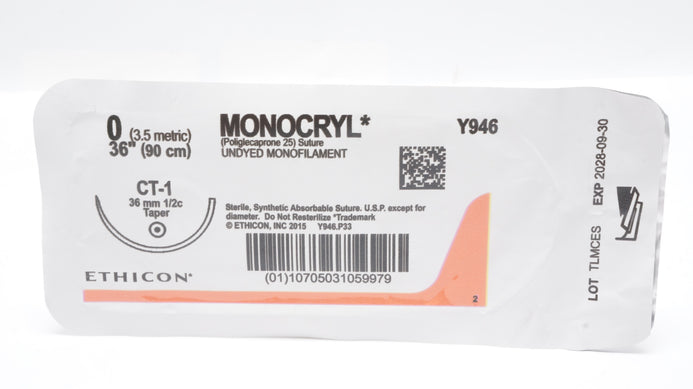 - Ethicon Y946 0 MONOCRYL Undyed Monofilament CT-1 36mm 1/2c Taper 36inch