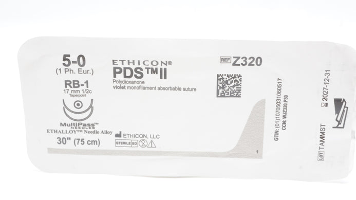 Ethicon Z320 5-0 PDS II Polydioxanone Suture Violet Monofilament RB-1 17mm 1/2c Taperpoint 30inch