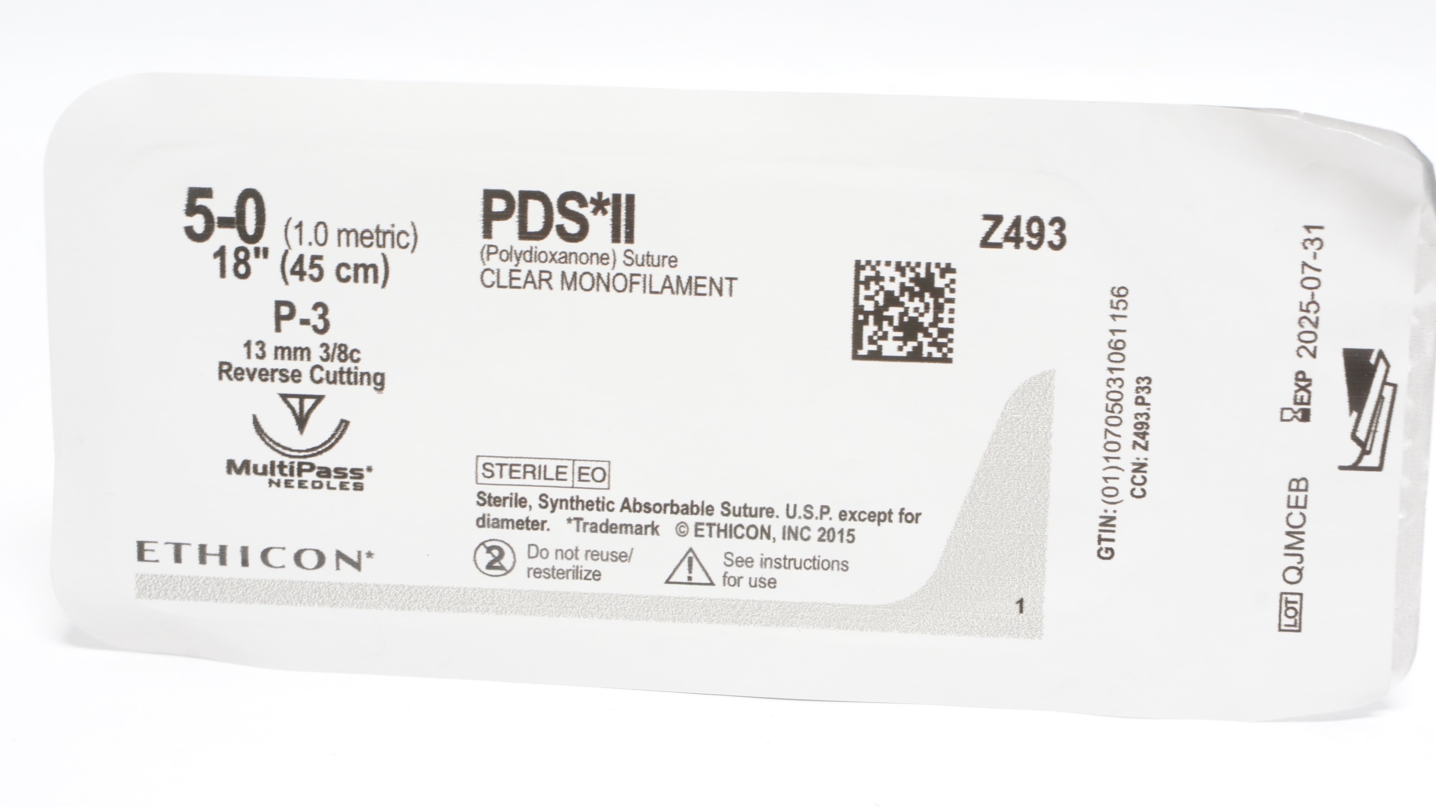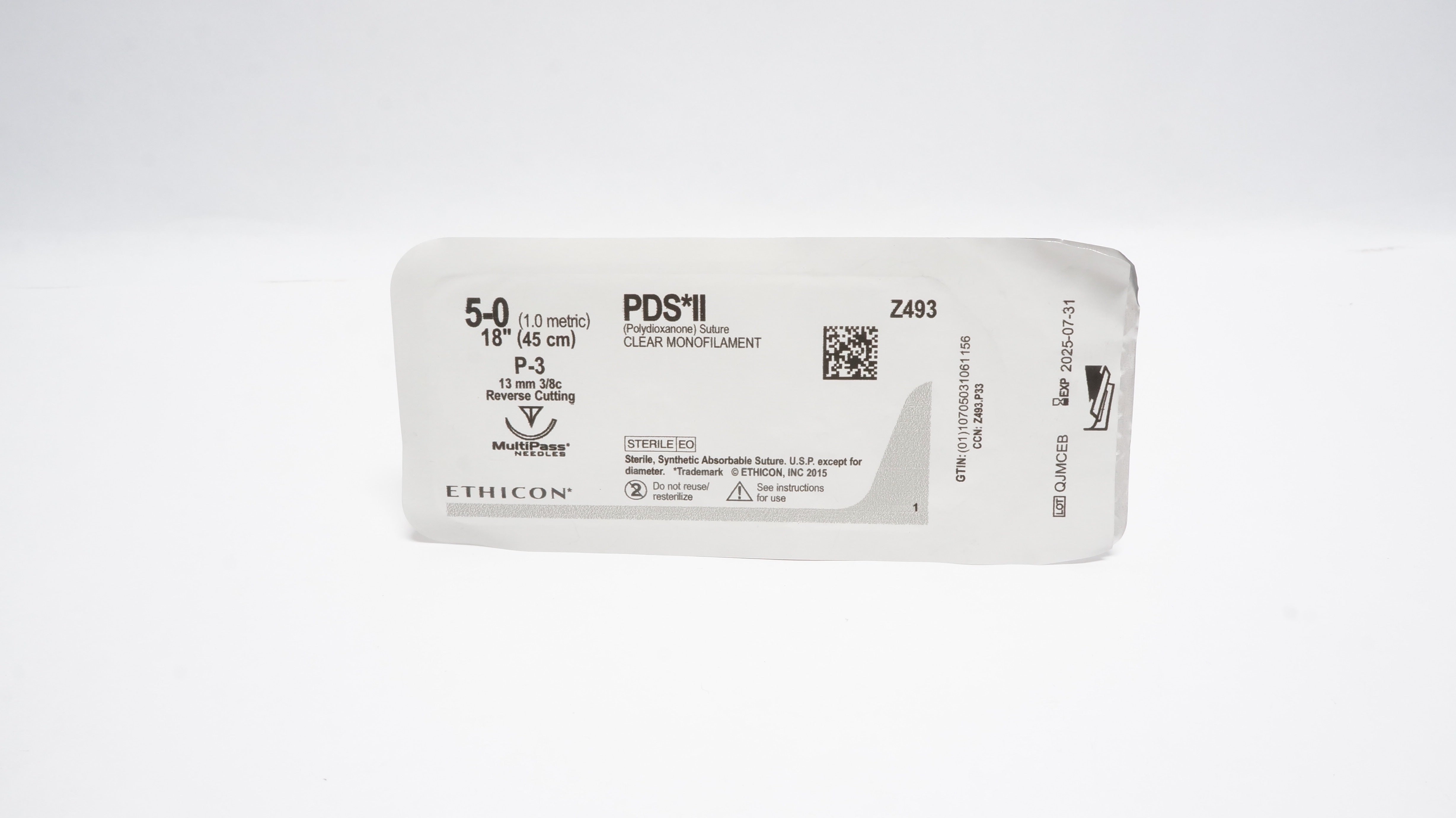 Ethicon Z493 5-0 PDS II Polydioxanone Stre P-3 13mm 3/8c Reverse Cutting 18in(x)