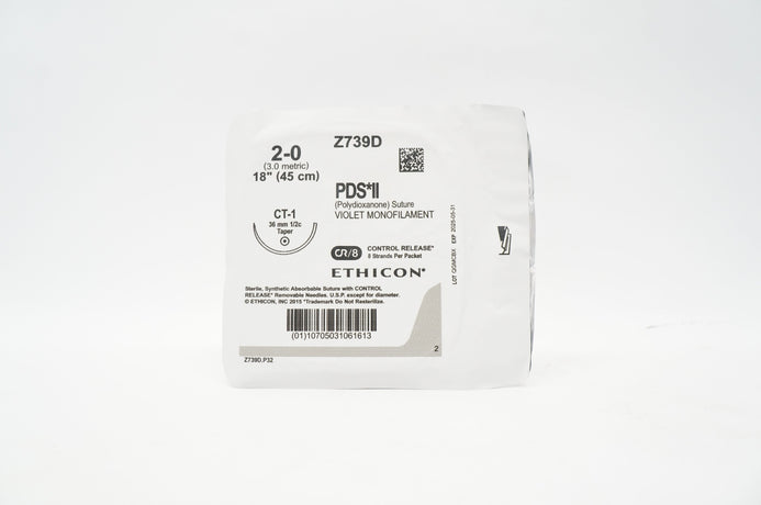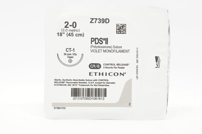 Ethicon Z739D 2-0 PDS II Polidioxanone Sterile Synthetic Absorbable Suture Violet Monofilament CT-1 36mm 1/2c Taper 18 inch, CR/8 8 Strands Per Packet