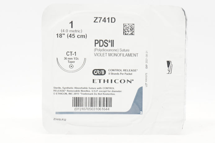 Ethicon Z741D 1 PDS II, Polydioxanone Sterile, Synthetic Absorbable Suture Violet Monofilament, CT-1 36mm 1/2c Taper, 18 inch, CR/8, 8 Strands Per Packet