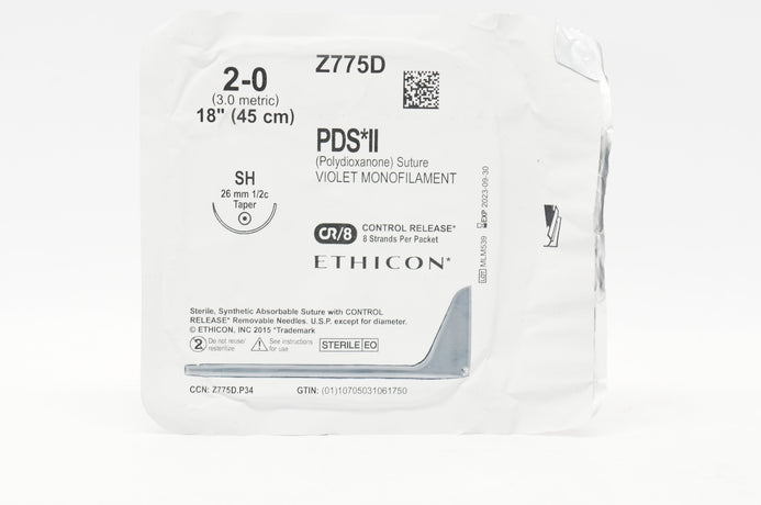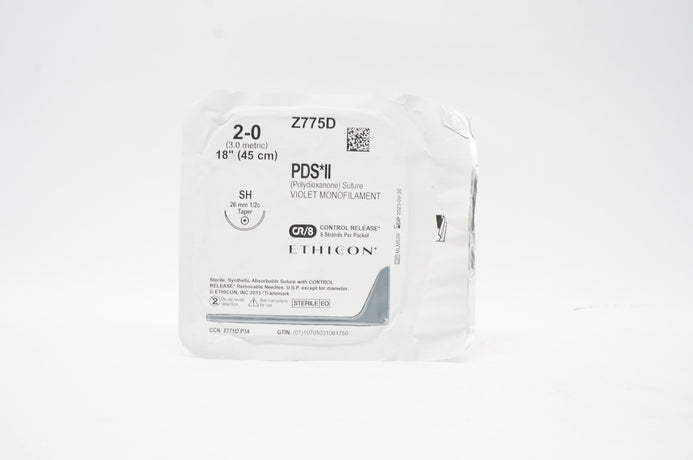 Ethicon Z775D 2-0 PDS II Polydioxanone Sterile, Synthetic Absorbable Suture Violet Monofilament SH 26mm 1/2c Taper, 18 inch CR/8, 8 Strand Per Packet