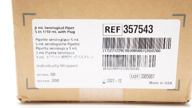 - Falcon 357543 5mL Serologicsl Pipet 5In 1/10ml W/Plug - Case of 200