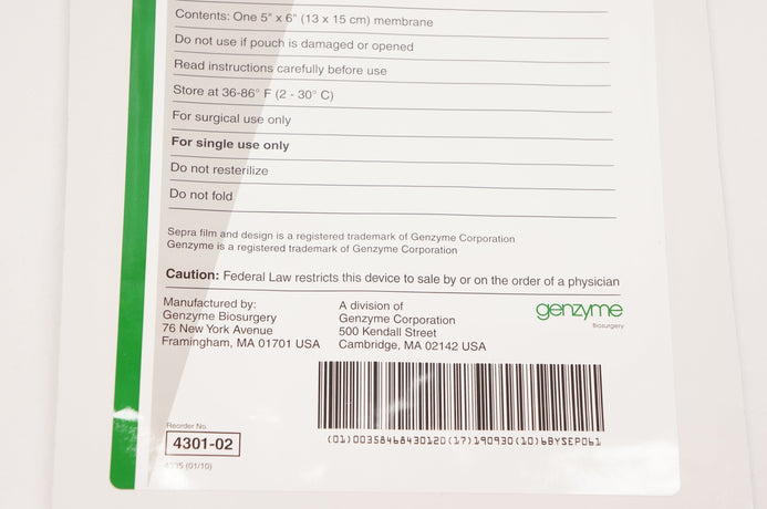 - Genzyme 4301-02 Sepra Film Adhesive Barrier 5inch x 6inch (x)