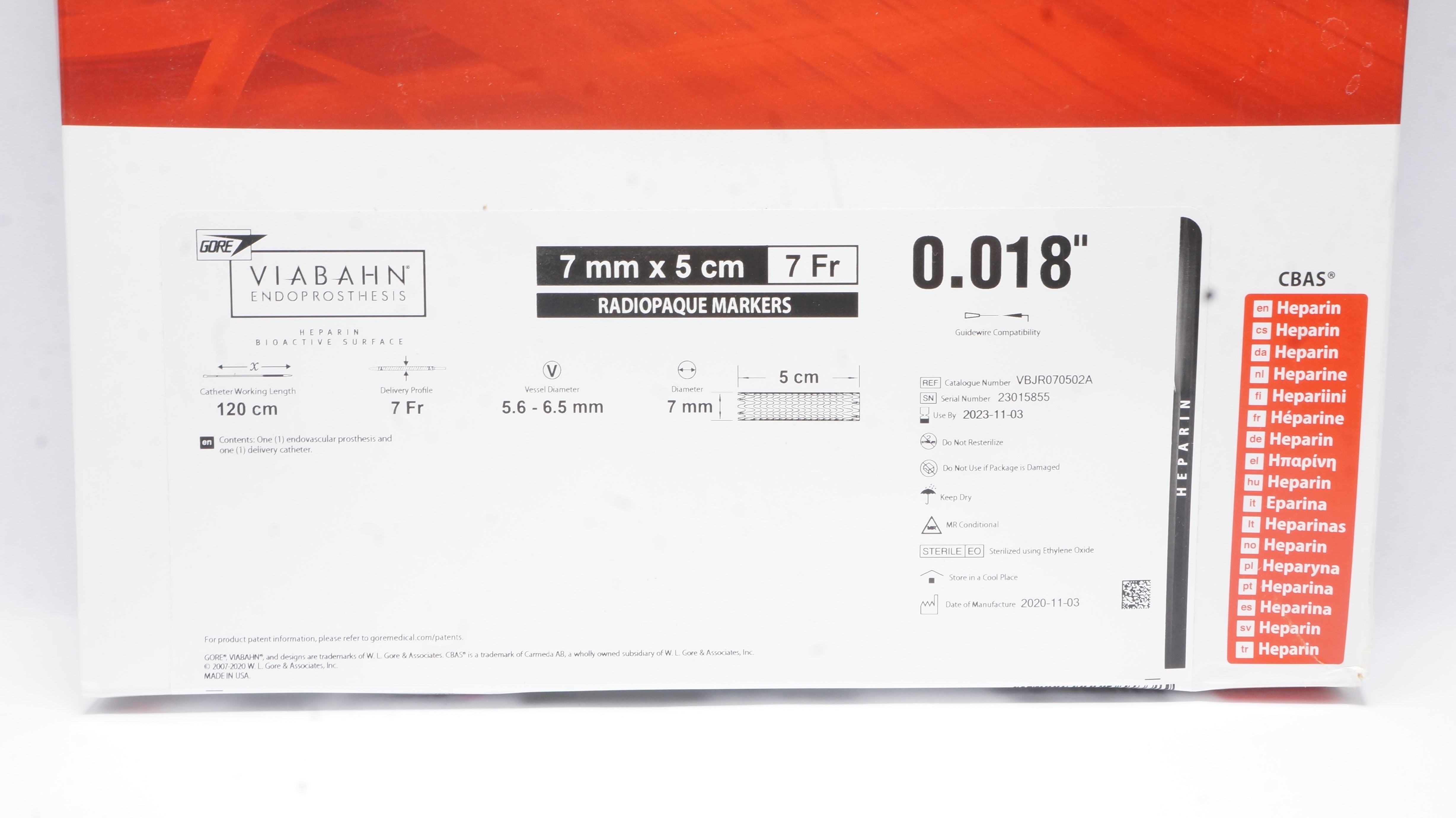 Gore VBJR070502A VIABAHN Endoprosthesis w/Heparin Bioactive Surface .018in., 7 mm x 5cm, 7Fr.