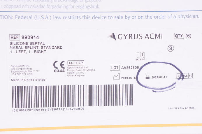 - Gyrus 890914 Silicone Septal Nasal Splint, Standard, 1 Left, 1 Right - Box of 6