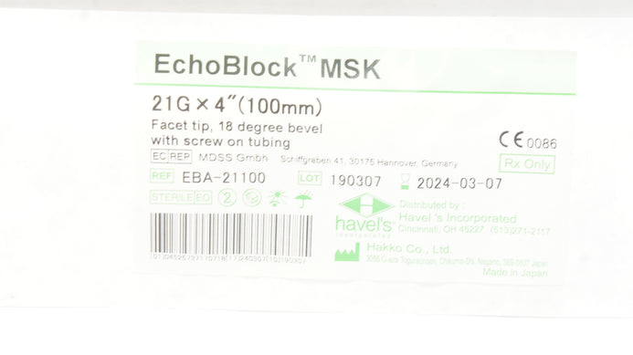 - Hakko EBA-21100 Havel's EchoBlock MSK Ultrasound Ndle 21G x 4inch (x)