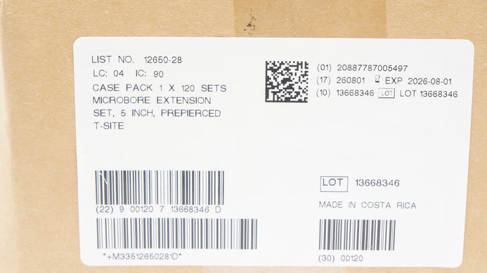- ICU Medical 12650-28 Microbore Extension Set 5inch Prepierced T-Site -Box of 120