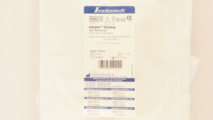 - Implantech 700-07 AlliedSil Sheeting Non-Reinforced 8inch x 6inch x .007inch (x)