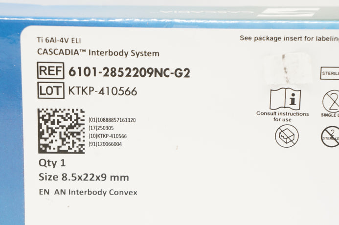 - K2M 6101-2852209NC-G2 Cascadia Interbody System 8.5 x 22 x 9mm