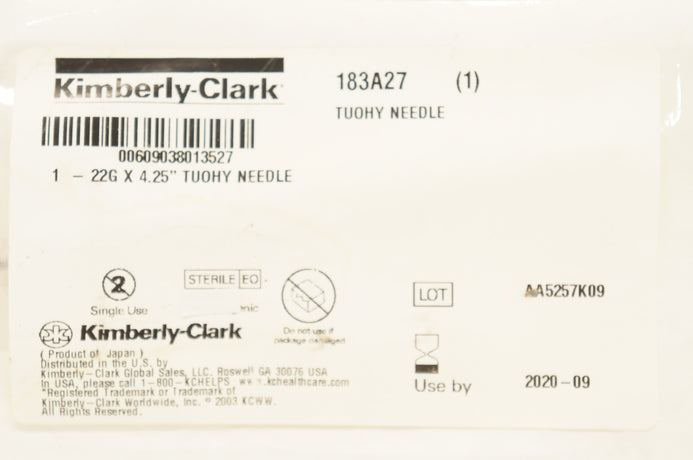 - Kimberly-Clark 183A27 Tuohy Needle 22 x 4.25inch (x)