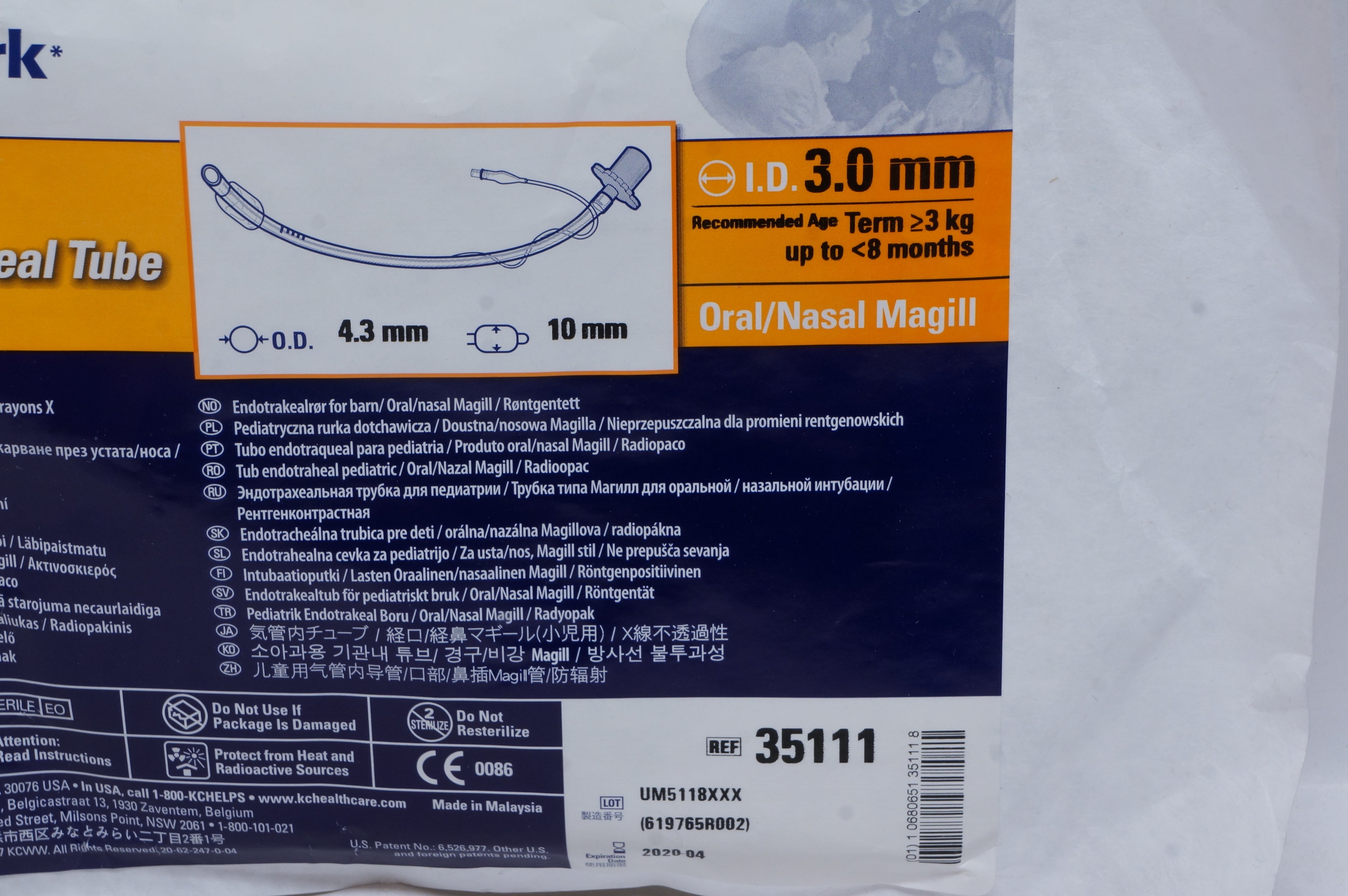 Kimberly-Clark 35111 KimVent Microcuff Endotracheal Tube 3.0mm ID
