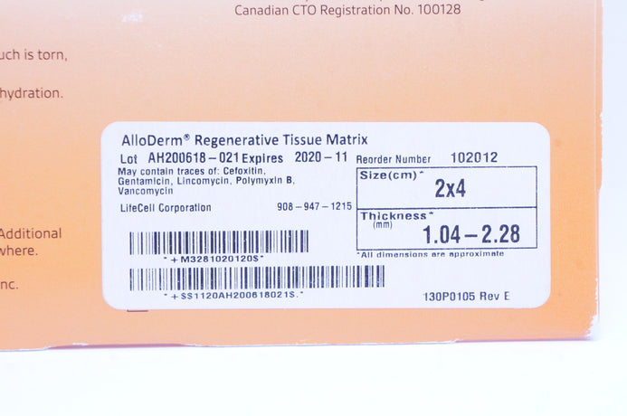 LifeCell 102012 Allergan AlloDerm Regenerative Tissue Matrix, Size 2x4 cm (x)