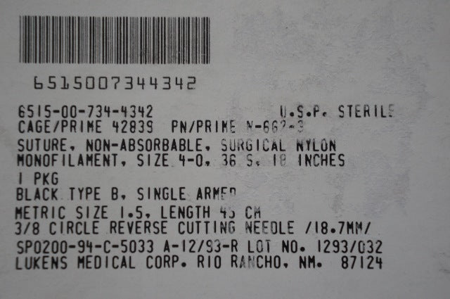 - Lukens N-662 4-0 NYLON, Black Monofilament 18