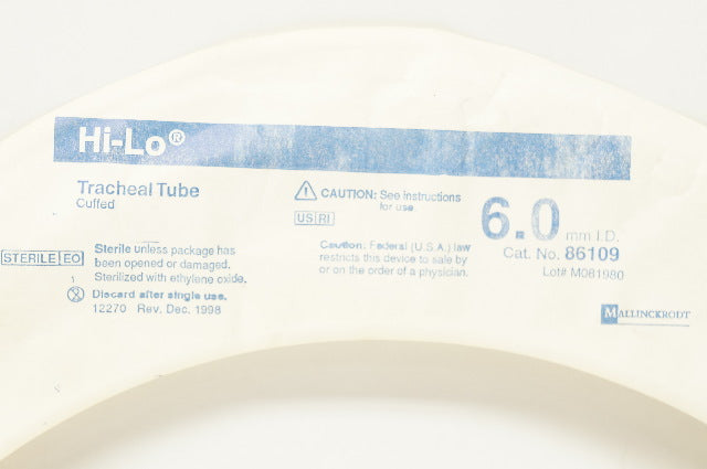- Mallinckrodt 86109 Hi-Lo Tracheal Tube Cuffed 6.0mm ID
