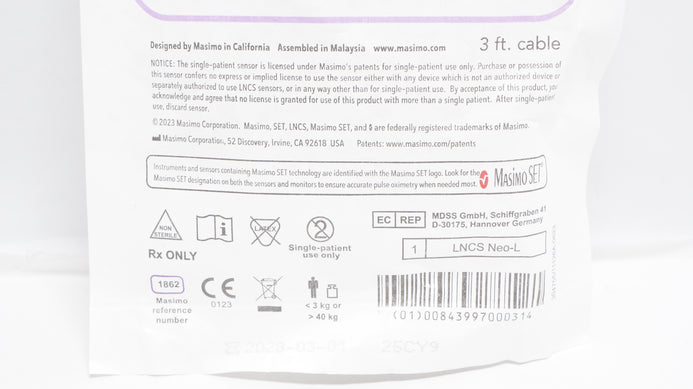 - Masimo 1862 LNCS Neo-L SpO₂ Neonatal/Adult Pulse Oximeter Adhesive Sensor