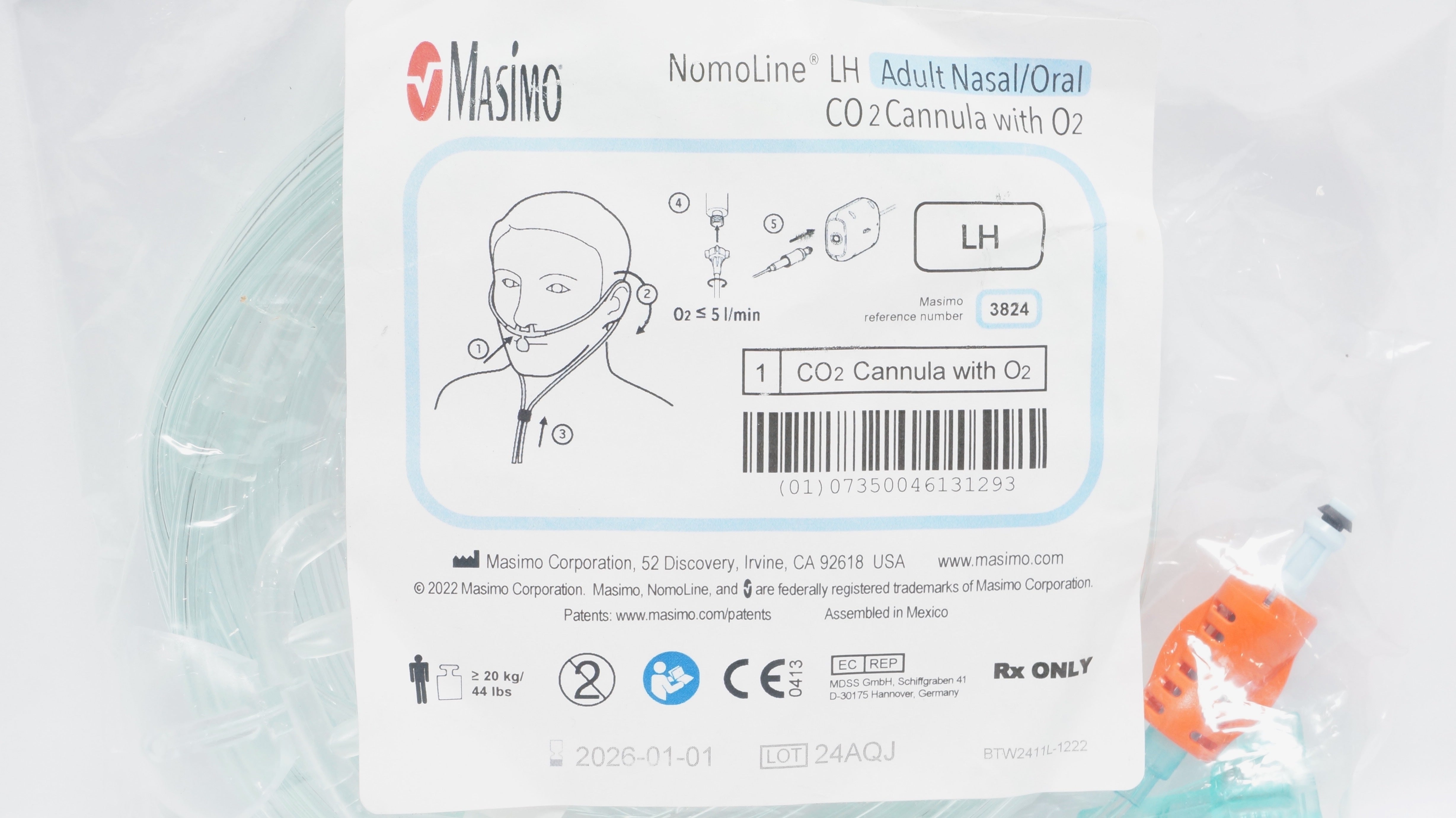 - Masimo 3824 LH Adult Nasal/Oral CO2 Cannula W/O2, >20kg x 44Ibs