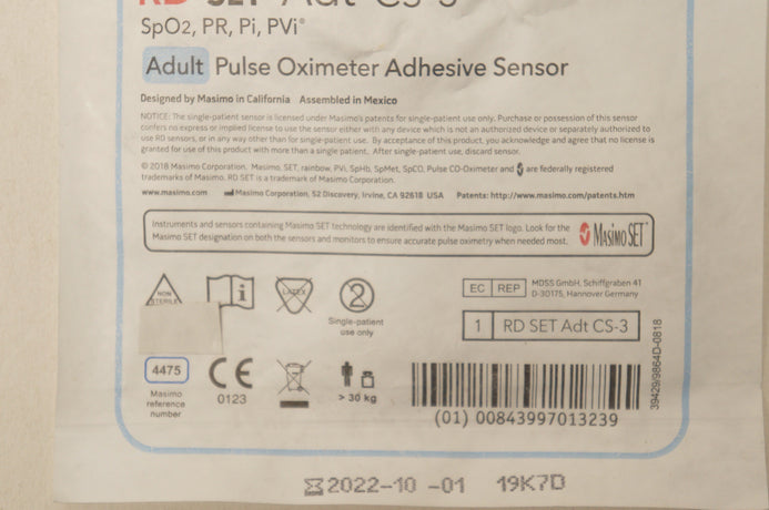Masimo 4475 RD Set Adt CS-3 Adult Pulse Oximeter Adhesive Sensor >30 kg