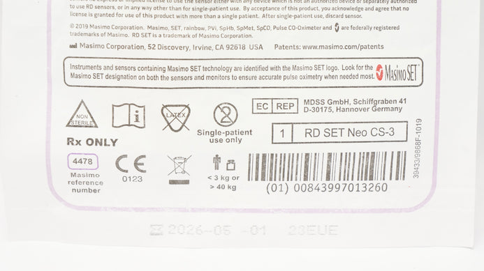 - Masimo 4478 Neo CS-3 Neonatal/Adult Pulse Oximeter Adhesive Sensor 40kg