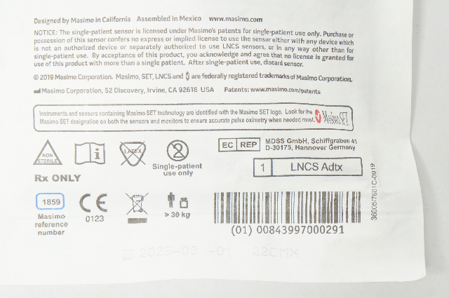 - MasimoSet 1859 LNCS Adtx SpO2 Adult Pulse Oximeter Adhesive Sensor >30kg