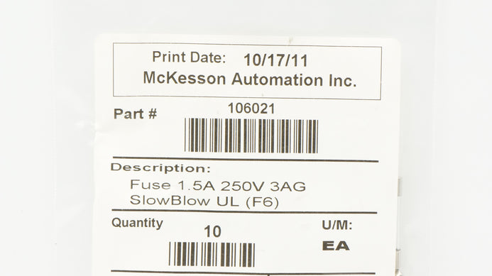 - McKesson 106021 Fuse 1.5A 250V 3AG SlowBlow UL - Pack of 10