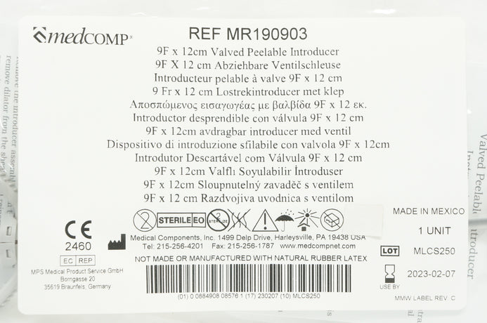 - Medcomp MR190903 Valved Peelable Introducer, 9F x 12cm