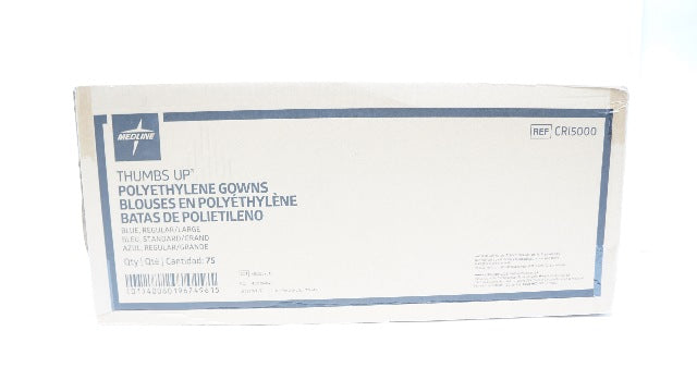Medline CRI5000 Thumbs Up Polyethylene Gowns, Over-the-Head Neck, Thumb Loop Wrists Regular Large, Blue