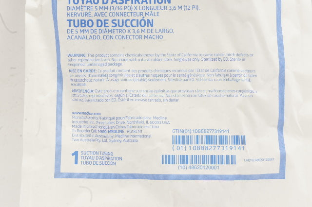 - Medline OR512 Suction Tubing Ribbed, with Male Connector 3/16 inch x 12ft.