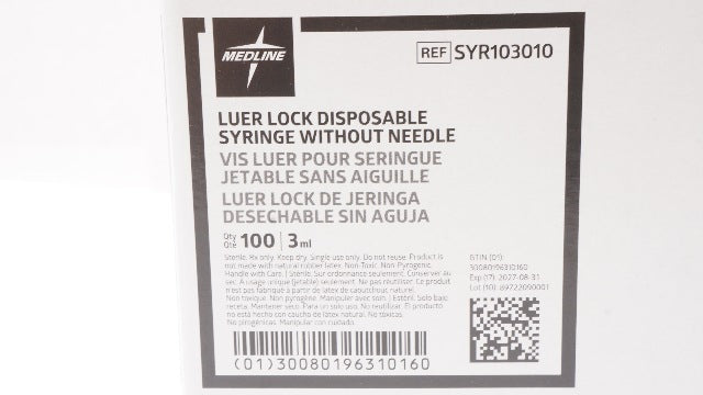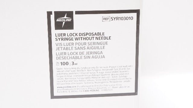 Medline SYR103010 3ml Luer Lock Disposable Syringe w/o Ndle - Box of 100