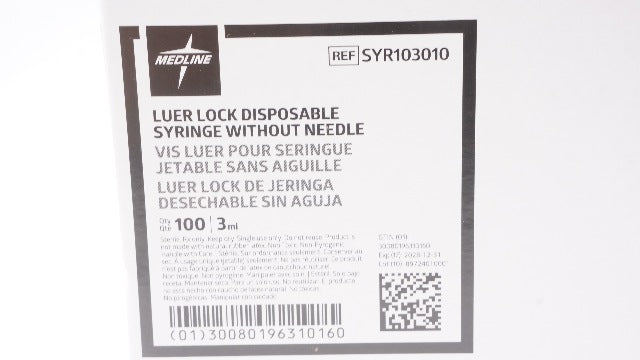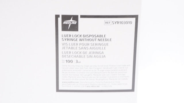 - Medline SYR103010 3ml Luer Lock Disposable Syringe w/o Ndle - Box of 100