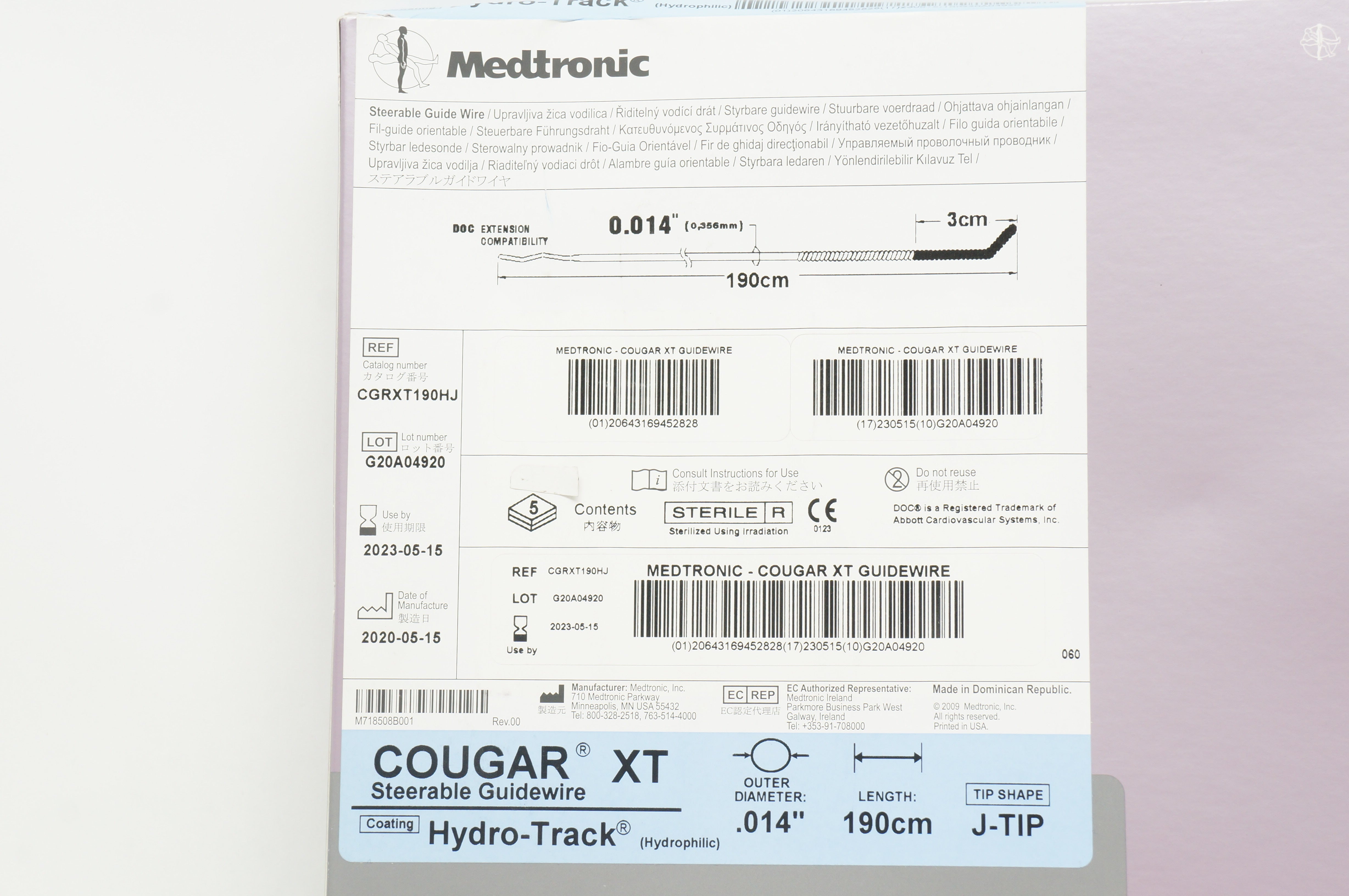 - Medtronic CGRXT190HJ Cougar XT Steerable Guidewire .014inch x 190cm - Box of 5