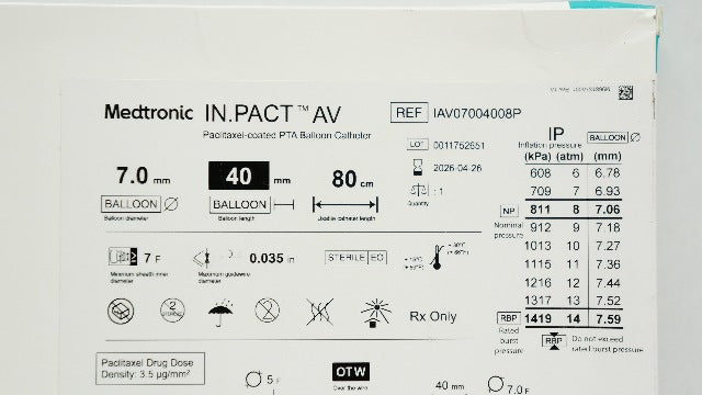 Medtronic IAV07004008P Paclitaxel-coated PTA Balloon Cath.035In,7.0 x 40mm x80cm