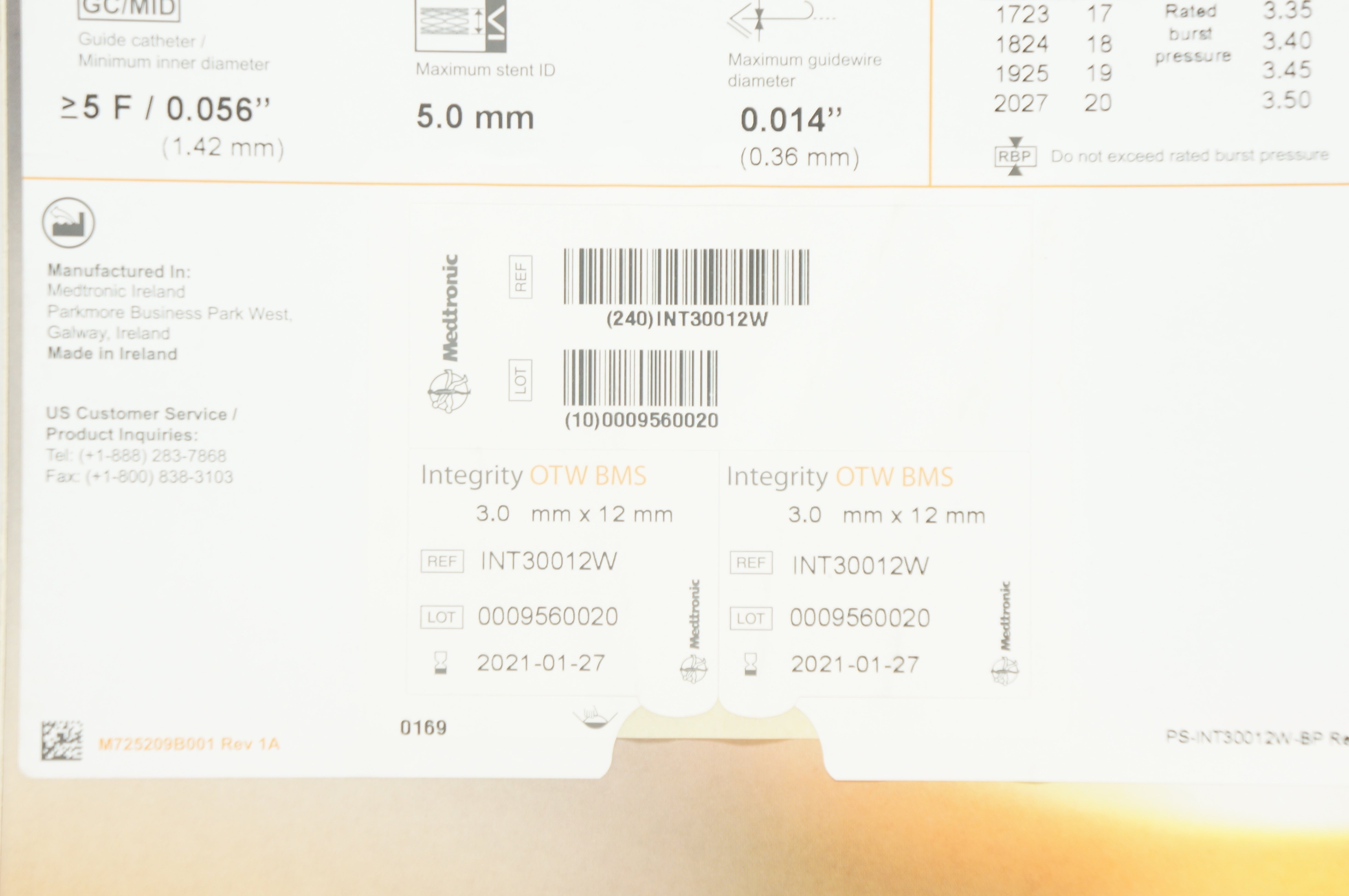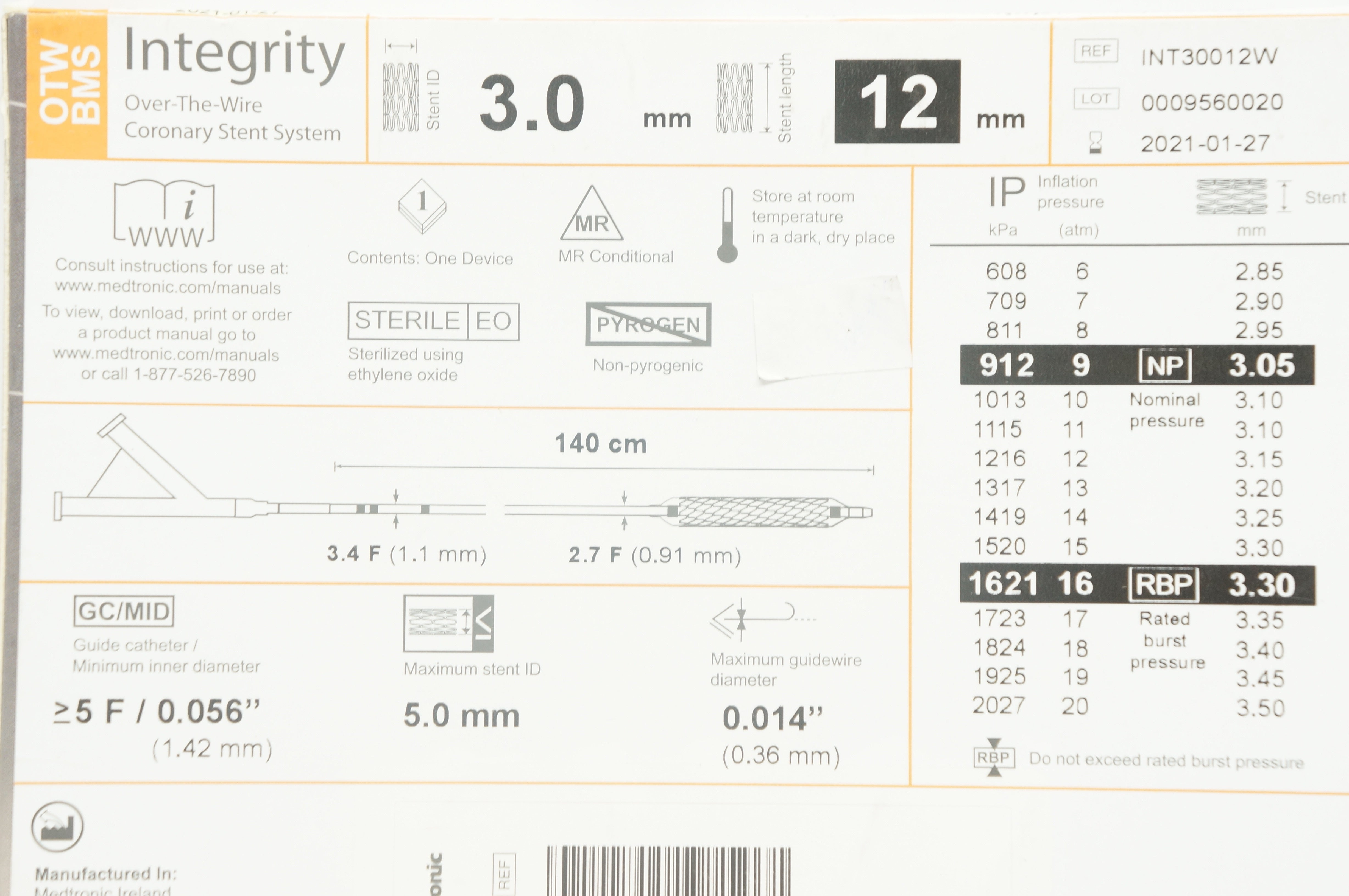Medtronic INT30012W Integrity OTW BMS Over-The-Wire Coronary Stnt System 3.0mm x 12mm