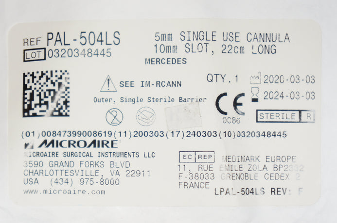 Microaire PAL-504LS 5mm Single Use Cannula 10mm Slot, 22 cm Long