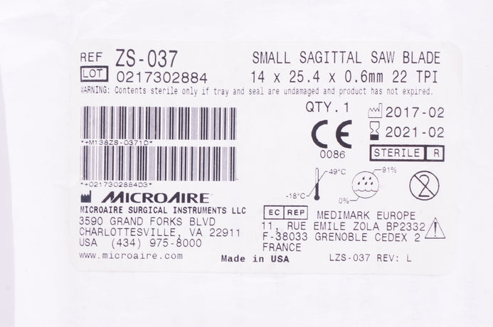 Microaire ZS-037 Small Sagittal Saw Blade 14x25.4x0.6mm 22 TPI (x)
