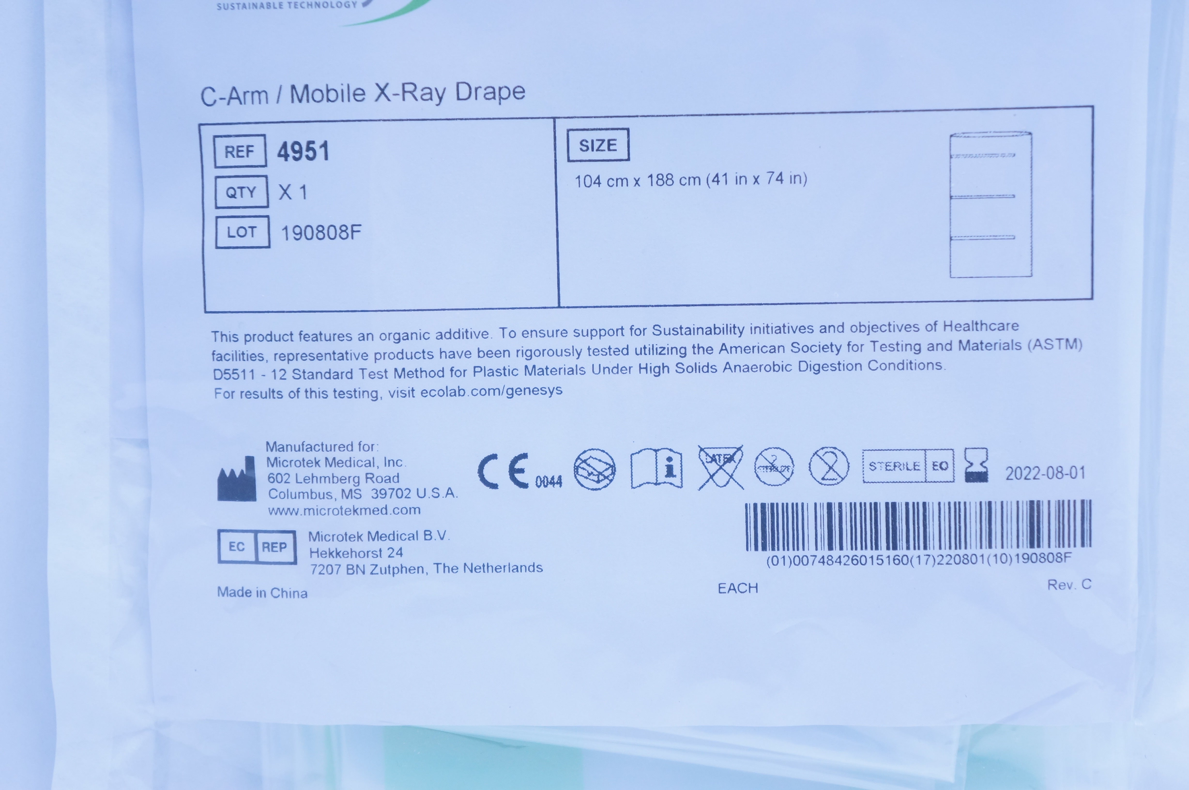 Microtek 4951 Genesys ECOLAB C-Arm/Mobile X-Ray Drape 41inch x 74inch