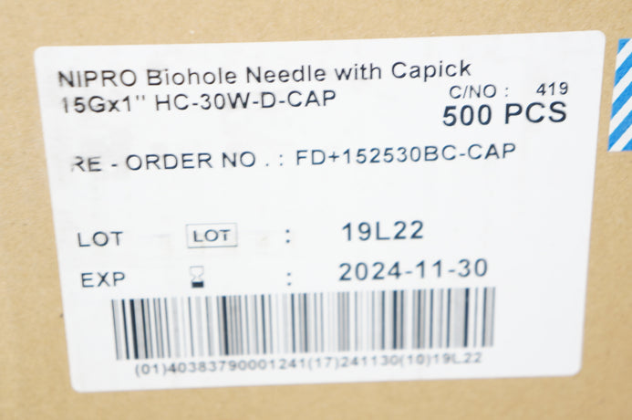 - Nipro FD+152530BC-CAP Biohole Ndle with Capick 15G x 1inch - Case of 500