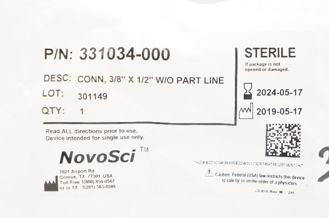NovoSci 331034-000 Connector, 3/8inch x 1/2inch W/O Part Line