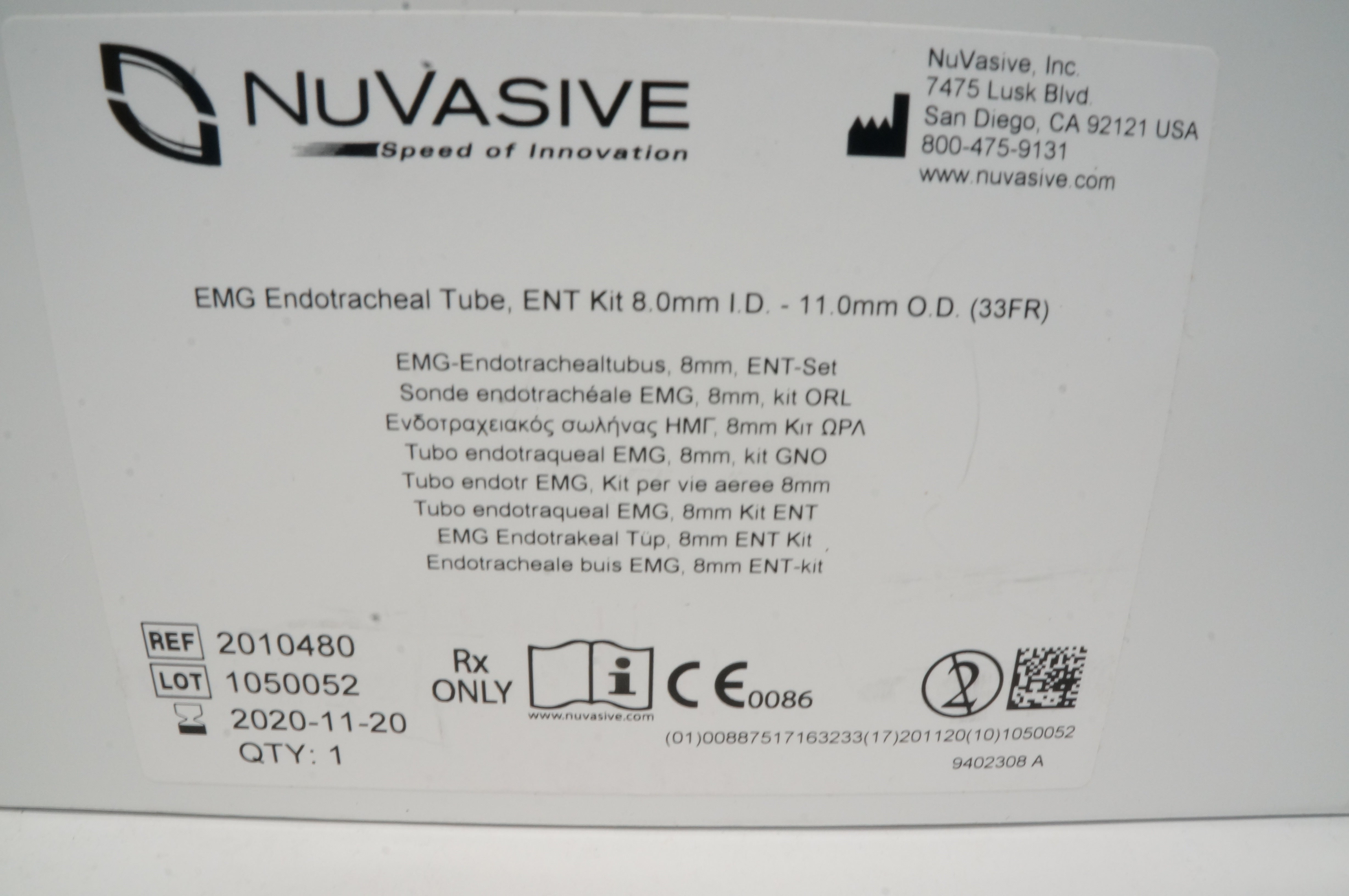 - NuVasive 2010480 EMG Endotracheal Tube, ENT Kit 8.0 x 11.0mm (x)