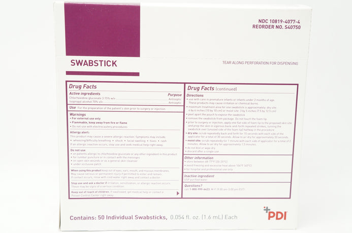 - PDI S40750 Chlorhexidine Gluconate Isopropyl Swabstick 0.054 fl.oz- Box of 50