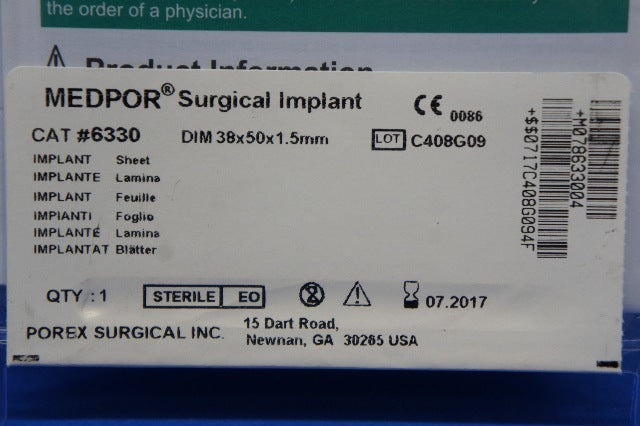 Porex 6330 MEDPOR Surgical Implant 38 x 50 x 1.5mm