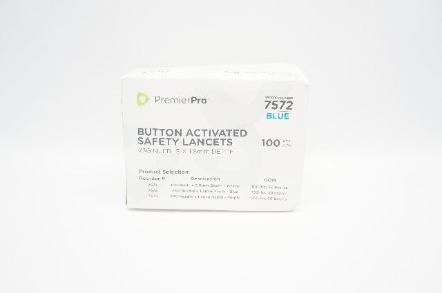 - PremierPro 7572 Button Activated Safety Lancets 23G Ndle.x1.8mm Depth -Box of 92